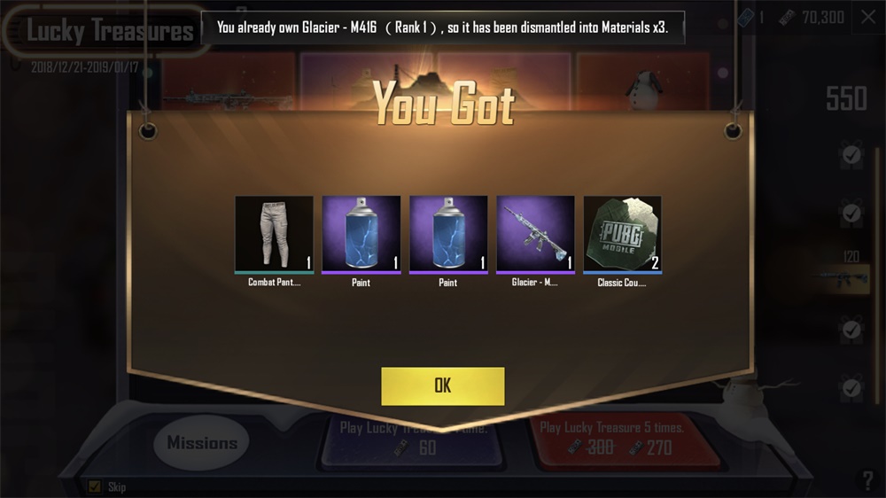 ولا تقلق حول الحظ - سيحصل كل لاعب على شكل Glacier - M416 القابل للترقية بعد لعب كنز الحظ 120 مرة. إذا ربحته بالفعل، سيتم تفكيكه إلى مواد ترقية تلقائيًا.
