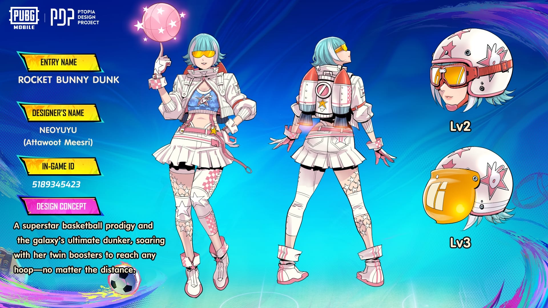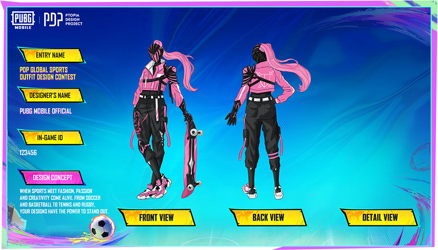 Entries must include a complete outfit design showing the front and back. Emphasis should be placed on the outfit design and accessories while following the proportions of PUBG MOBILE characters. Avoid overdesigning the character or background elements. Instead, the focus should remain on innovative and creative design. Make sure your creation fits the sports theme and suits the game's art style!
